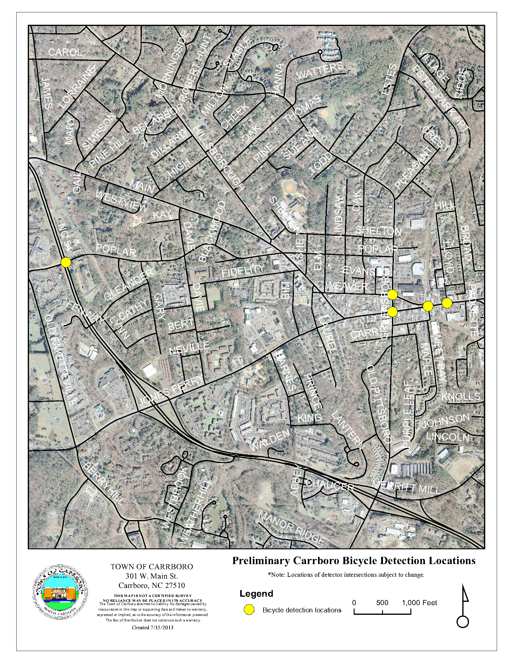 Installation of bicycle loop detectors at intersections in the downtown and at West Poplar/NC 54, to advance the traffic signals for bicyclists.